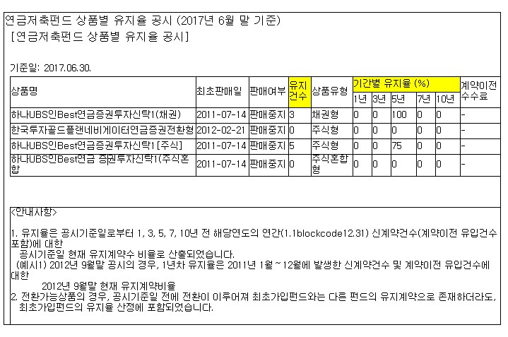 연금저축펀드 상품별 유지율 공시 (2017년 6월 말 기준)