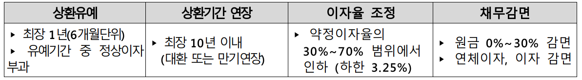 개요 : 채무를 정상적으로 상환할 수 없는 과중 채무자를 대상으로 상환기간 연장, 이자율 조정, 채무감면 등을 통해 본인의 상환능력에 맞게 채무를 조정하는 절차